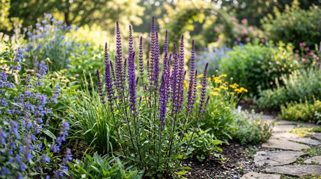 Salvia produces high vertical spikes which create a new garden shape through its showy blooms. The plant becomes a common choice for contemporary outdoor spaces because it repels deer while showing royal purple flowers throughout the warmest summer days.