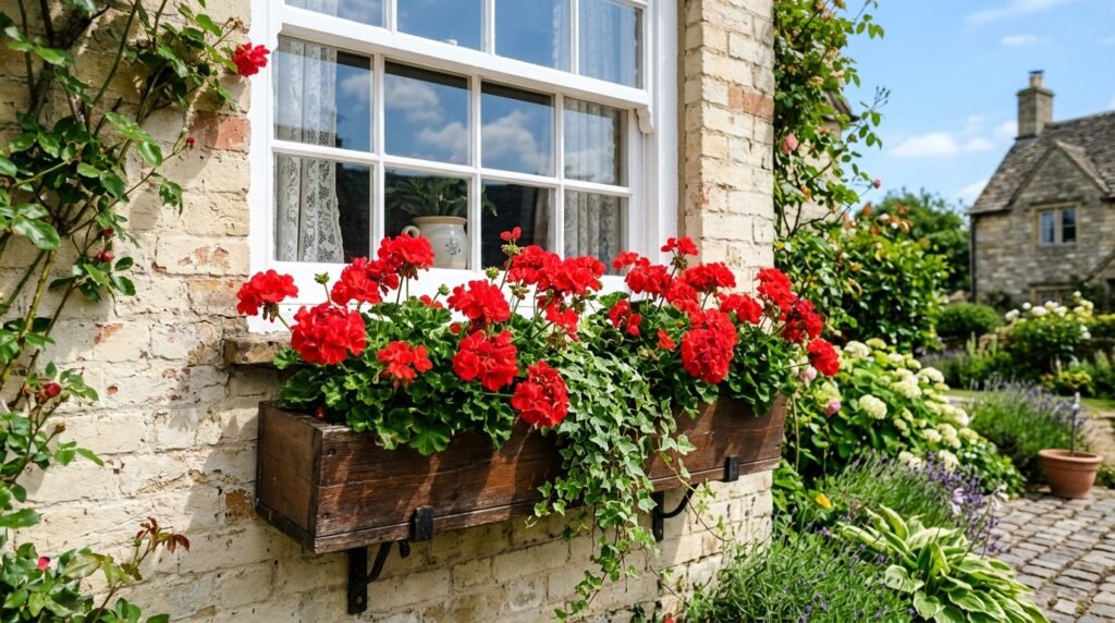 Geraniums become a popular window box plant because they produce vibrant red flower clusters. The plant uses its fat stems to store moisture which enables it to maintain its blooming state during the summer’s strongest sunny periods.