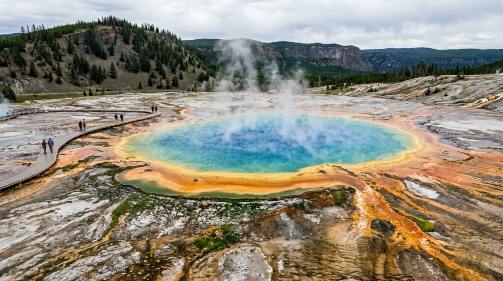 The Grand Prismatic Spring resembles a rainbow which has landed on the earth and the vibrant rings of orange, yellow, and green are produced by heat-loving bacteria which demonstrate that nature functions as the world’s supreme abstract artist.
