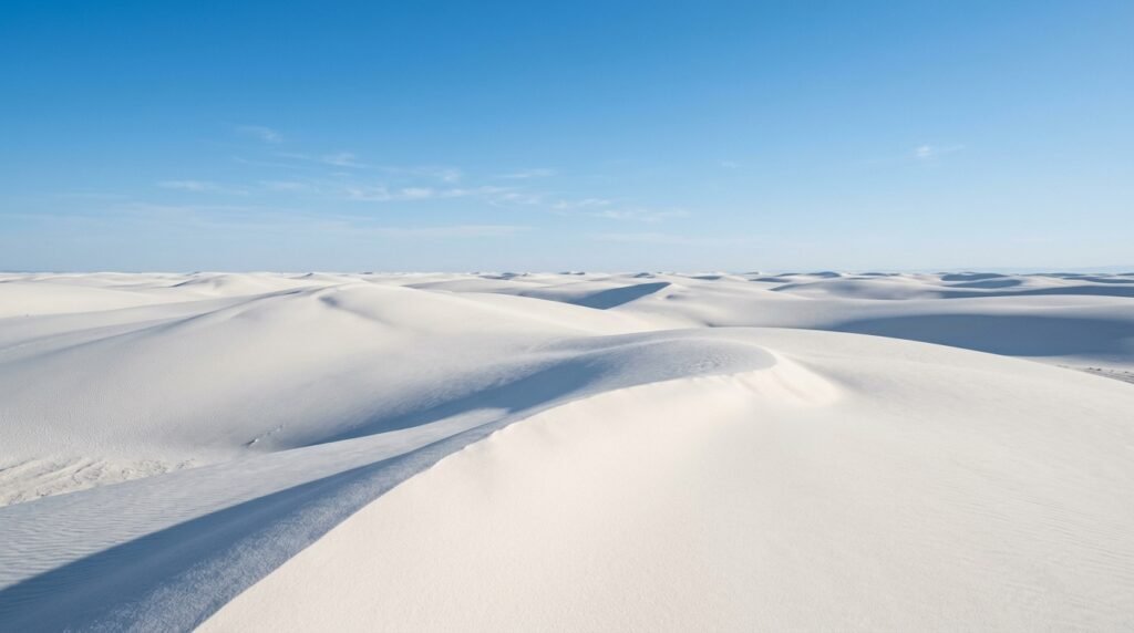 The world’s largest gypsum dune field in New Mexico appears as a powdered sugar sea. The summer dunes maintain their cool temperature which creates a silent natural environment that feels completely different from contemporary urban life.