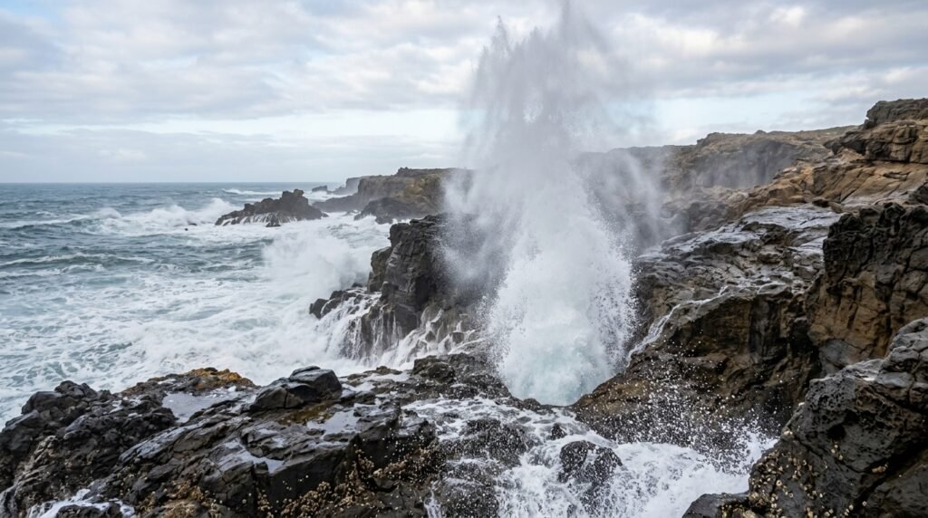 The natural sea geyser functions as a massive cooking device which uses pressure to operate. The ocean water enters the basalt rock through a tide-controlled opening which results in a massive saltwater spray being launched into the sky with a rhythmic whooshing sound.