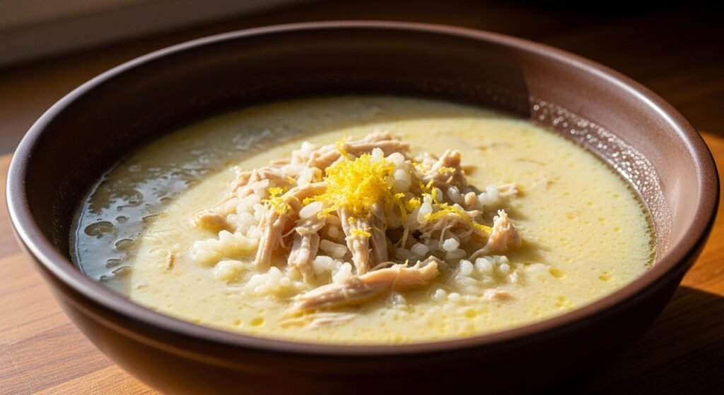This soup goes by Avgolemono. A mix of chicken, rice, egg, and lemon gives it warmth without losing depth on the protein front.