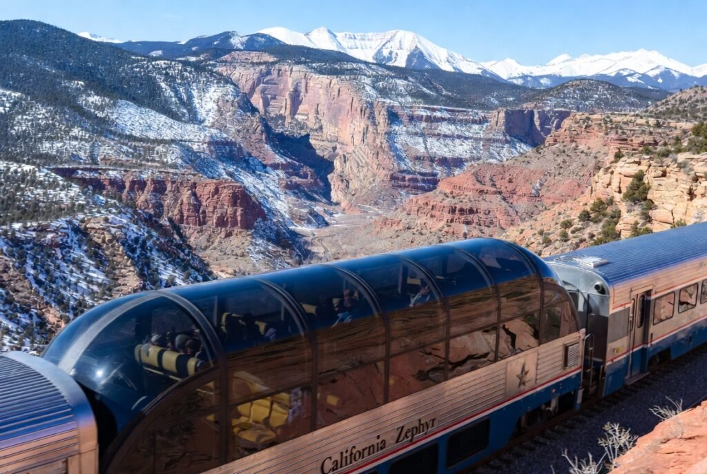 The well-known train line between Chicago and San Francisco serves as the most beautiful train route in all of North America and the journey takes you through the heart of the Colorado Rockies and the Sierra Nevada mountains. The observation car offers an exceptional viewing experience which combines glass walls with red rock canyon and snow-covered Gore Canyon views.