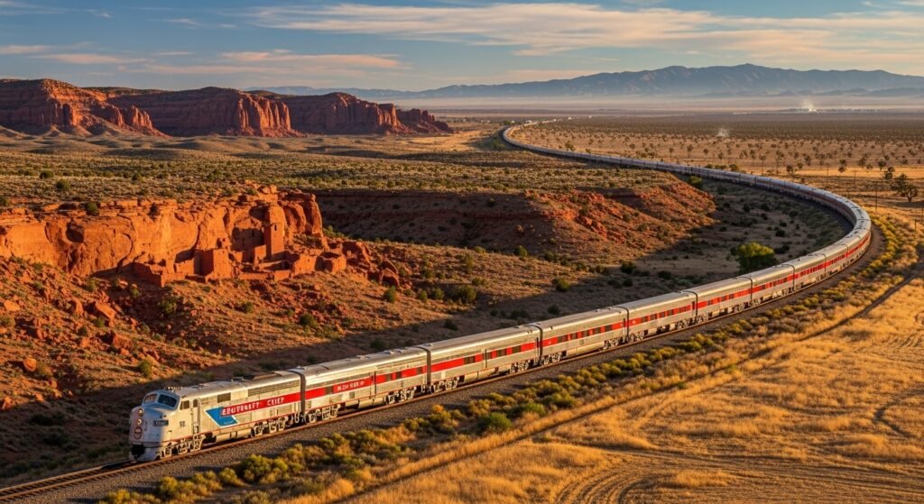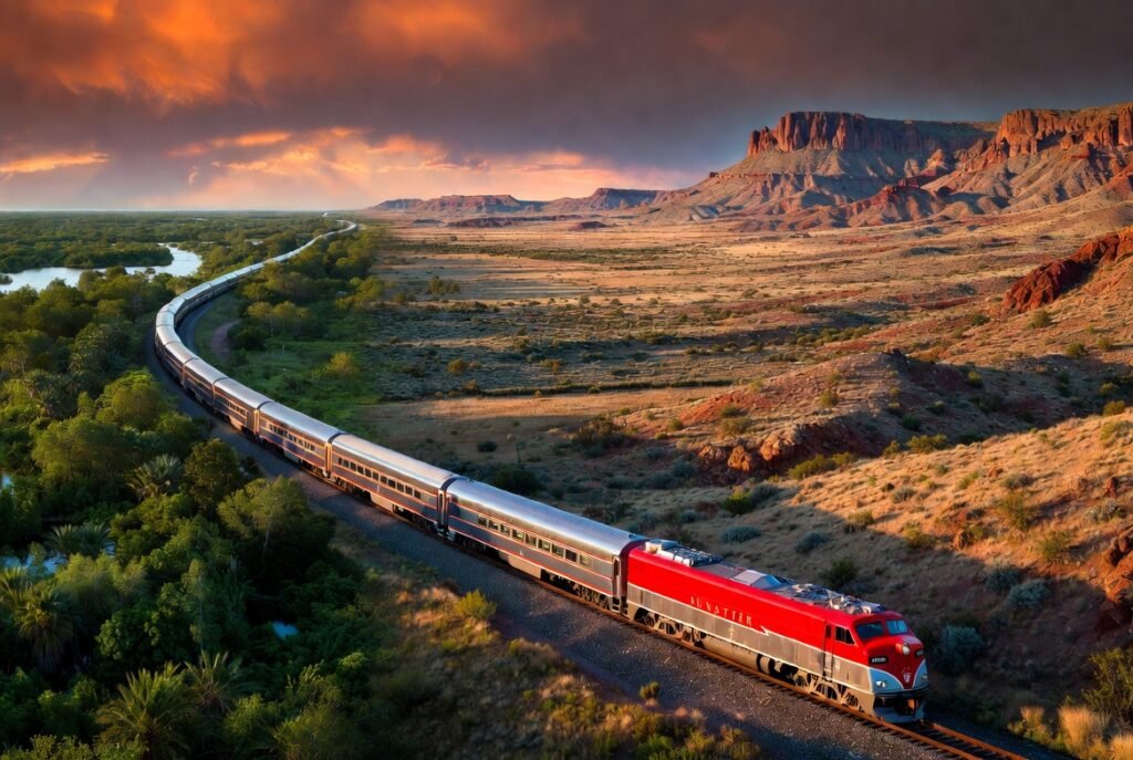 The southernmost train line connects New Orleans with Los Angeles through this route. The train ride takes you through Louisiana’s bayous and the expansive Texas plains and the high deserts of Arizona. The route creates a special experience which shows how the Southern jazz culture transitions into the palm tree-filled atmosphere of the West Coast.