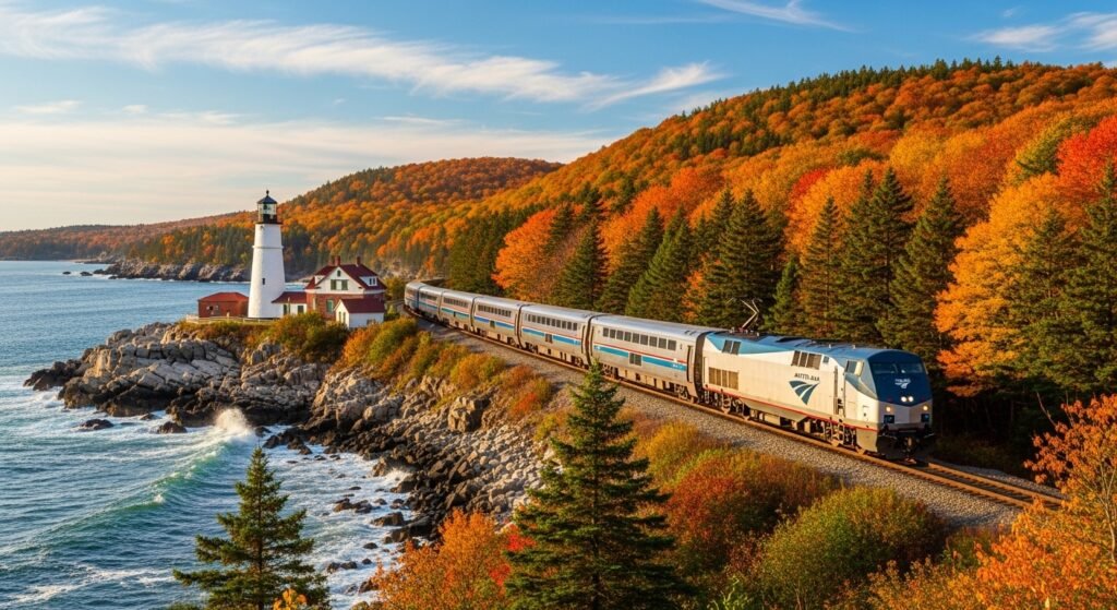 The train route from Boston to Brunswick Maine provides passengers with an authentic New England experience and the autumn season becomes especially memorable because the trees display their vibrant orange and red colors and the route extends through historical colonial towns while displaying the rocky coastline of Maine and its famous lighthouses.