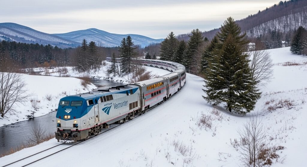 The train route from Washington D.C. to northern Vermont provides a beautiful scenic journey through the entire Northeast region and the area transforms from bustling cities into rolling Green Mountains and peaceful agricultural territories. The Vermont landscape reaches its most beautiful state during winter when snow covers all parts of the state.