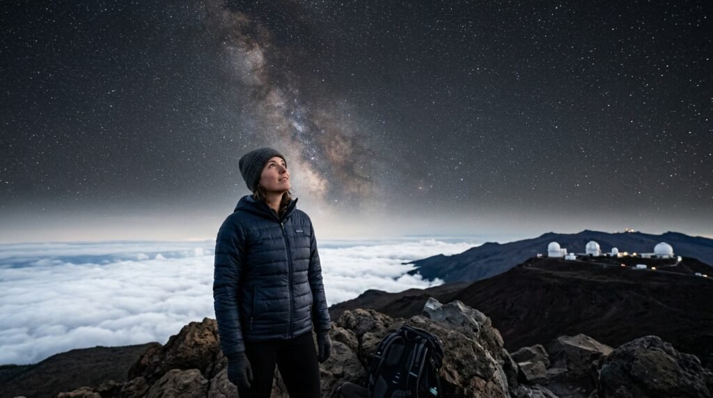 The world’s largest astronomical observatory operates from this dormant volcano location and the stars appear as diamonds because the air becomes extremely thin and dry at this altitude which rises above the cloud line.