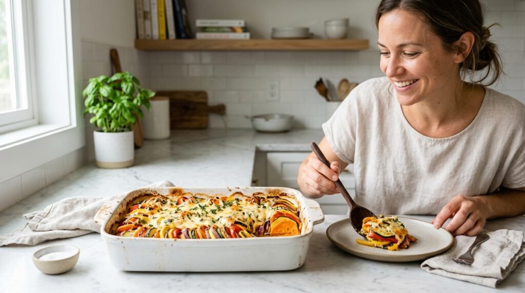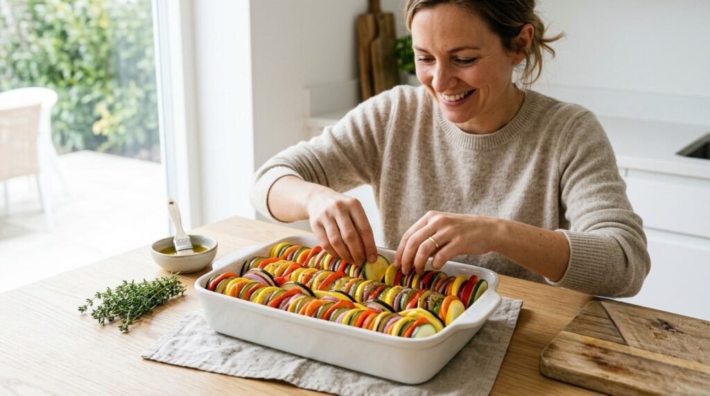The dish creates an elegant shingle appearance through its method of vertically stacking zucchini slices with tomato and potato slices. The dish presents a visually appealing appearance which showcases vegetables to an extent that it seems suitable for professional culinary magazines.