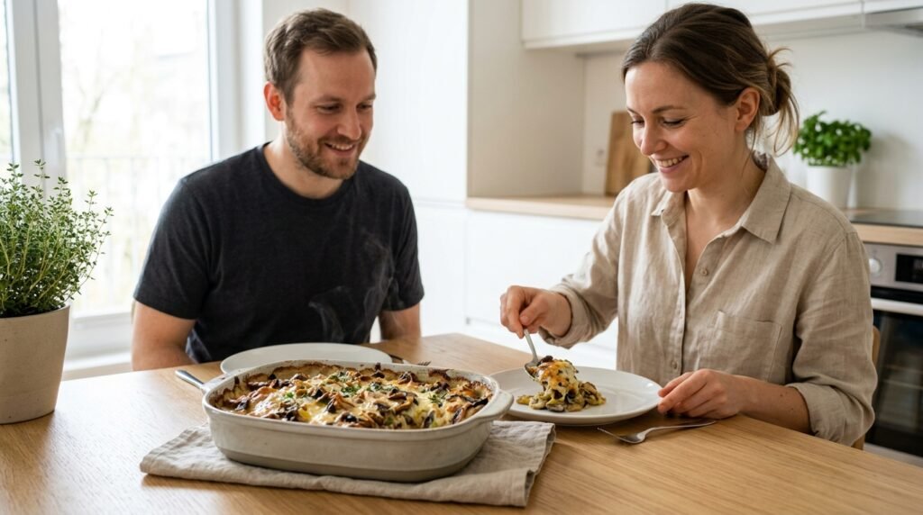The dish uses shiitake mushrooms together with leeks which have been sautéed to create its savory flavor profile and the dish functions as the ideal brunch option because it requires no monitoring during cooking while maintaining its elegant appearance when served with fresh greens.