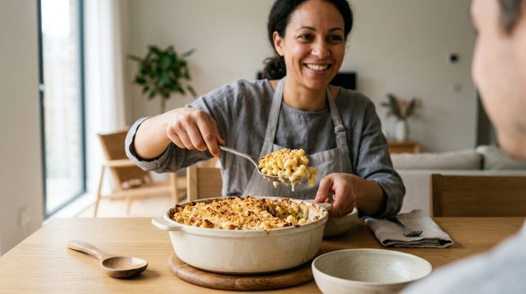 The classic comfort food transforms into an improved dish through the addition of white truffle oil and a panko-parmesan topping which transforms a cherished childhood meal into a refined side dish that matches perfectly with a luxurious steak dinner.
