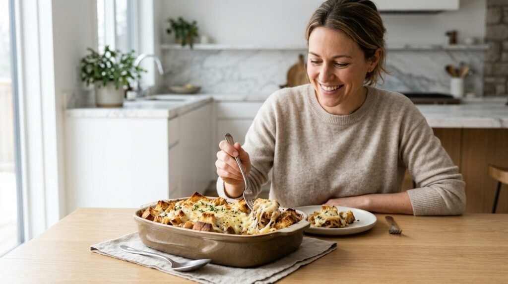 The dish combines two essential soup elements by turning caramelized onions and soaked bread into a baked creation and the dish provides a satisfying experience which contains intense umami flavor without needing separate serving dishes.