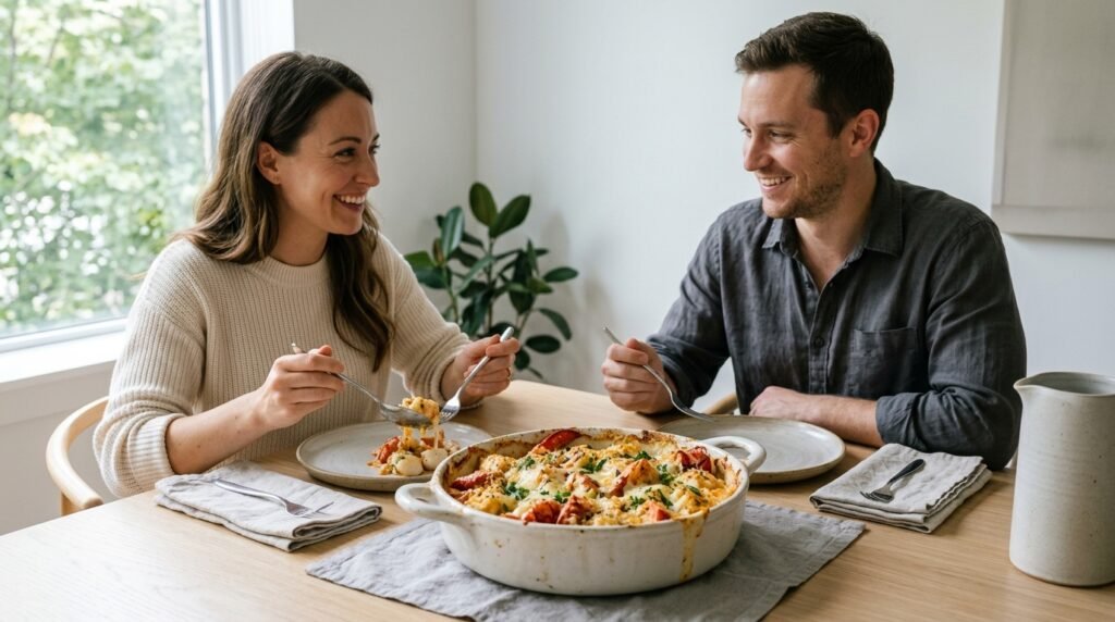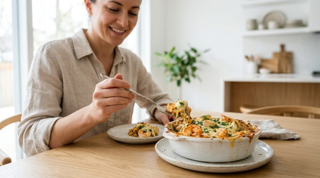 The dish replaces chicken with tender shrimp and scallops which exist in a creamy sauce and the melted Gruyère cheese produces a nutty flavor which forms a golden bubbling top that creates the experience of dining at a coastal restaurant.