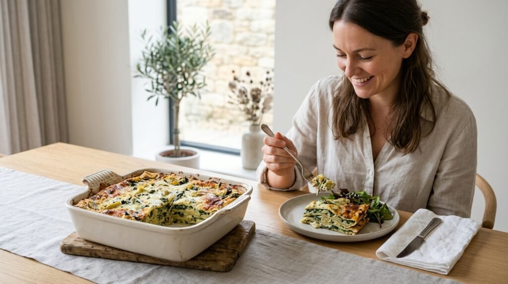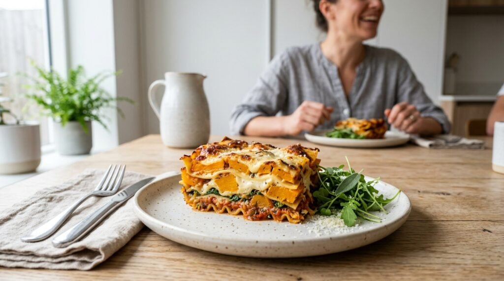 The dish substitutes traditional red sauce with two components which include a creamy béchamel sauce and layers of roasted squash and sage and the dish presents an orange and white pattern which creates a sweet and savory taste that people love to eat during the autumn season.