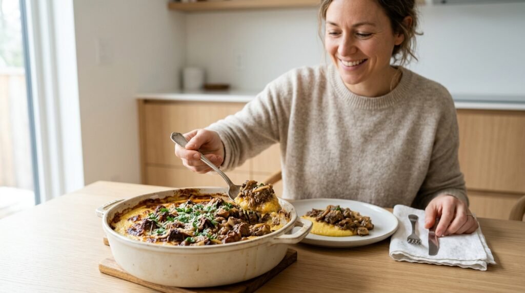 The dish transforms luxurious ingredients into pie form through its combination of slow-cooked short ribs and creamy polenta base. The meat reaches such an extreme tenderness that it disintegrates into cornmeal which creates the ultimate comfort food for wintertime.