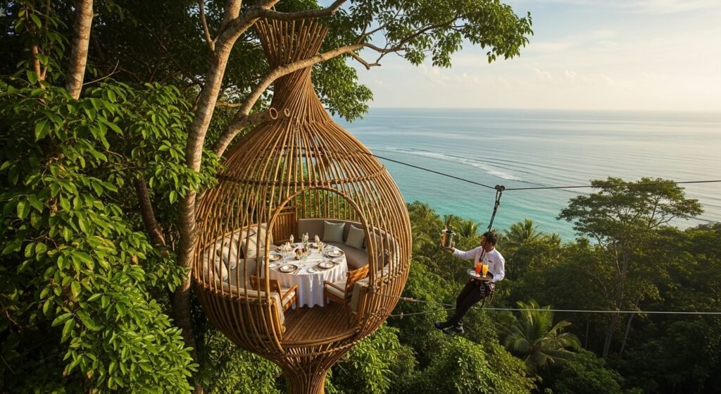 At this location instead of a conventional dining table you will dine inside a bamboo “pod” which hangs suspended in the rainforest trees and your waiter uses a zipline to deliver your meal while you watch the Gulf of Thailand.