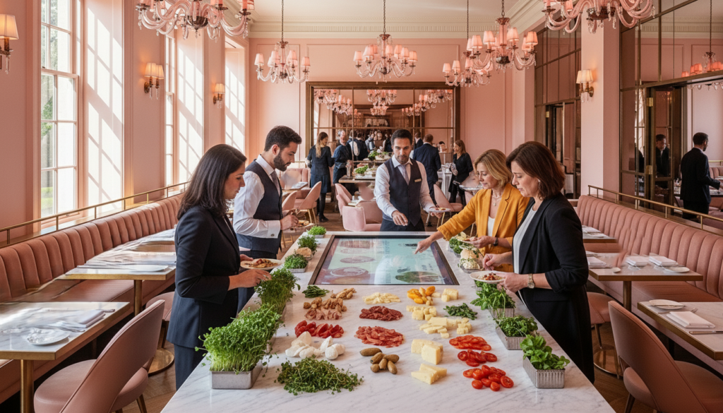 The Connaught Hotel houses this pink dining area which displays the most sophisticated dining atmosphere. The dining experience enables guests to create their own dishes by selecting ingredients from a marble board system, which transforms the menu into an interactive entertaining experience.
