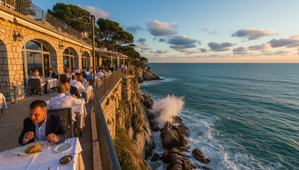 Since the 1700s this terrace dining establishment has operated from its cliffside position which provides views of the Adriatic Sea. The dining experience includes eating pasta while waves crash against the rocks which are located directly below your dining spot.