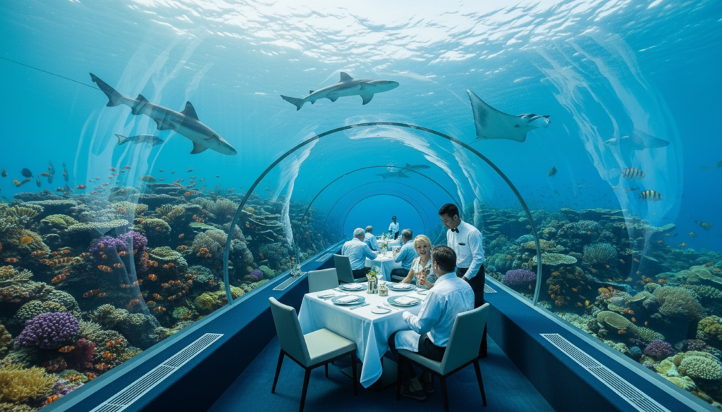 Guests can dine five meters underwater while taking in 270-degree views of vibrant coral reefs and sharks swimming through the water and this restaurant functions as the world’s initial dining establishment which uses glass materials for its entire underwater dining experience.