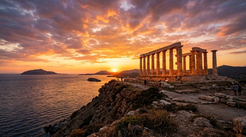 The experience of watching the sunset from the Temple of Poseidon brings strong emotional impact and the ancient marble columns shine orange at the ocean border, just like they have done for many centuries which marks the beginning of Athens territory.