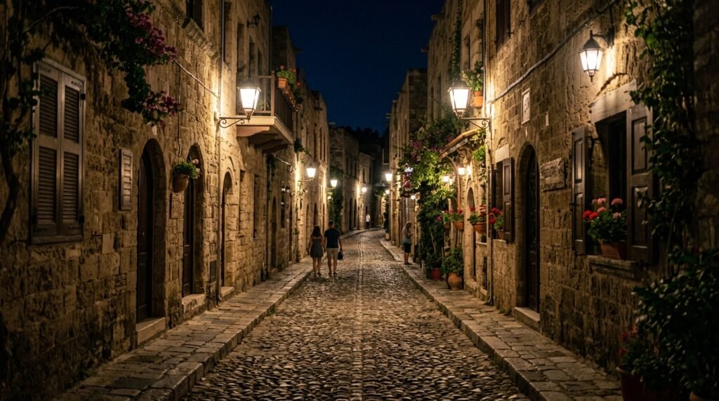 The Old Town of Rhodes reveals its historical charm to visitors who walk its streets after sunset. The lanterns illuminate the cobblestone streets which create shadows on the Palace of the Grand Master and produce a royal atmosphere filled with secretive beauty.