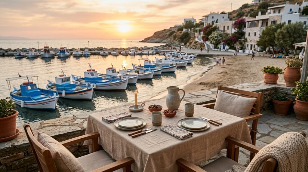 At Agia Anna you can eat your meal while sitting close to the beach so you can see the fishing boats coming back and the octopus and local cheese which we share at night create an unpretentious experience which connects us to the island’s natural pace of life.