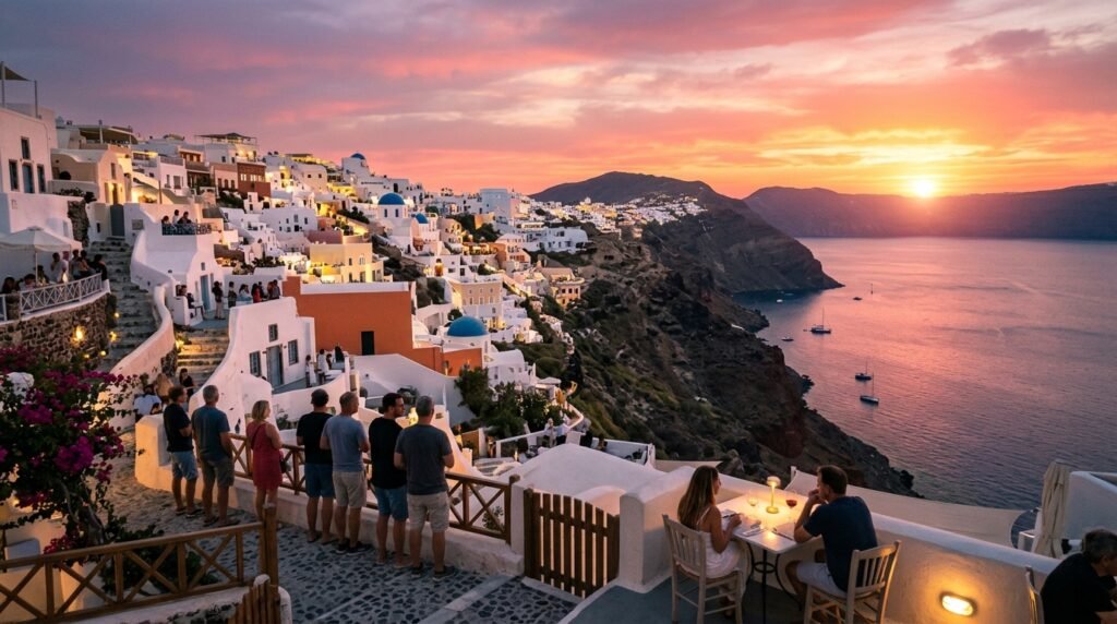 The Oia sunset at Santorini brings worldwide recognition. People gather to see the sun set over the Aegean Sea while white buildings change to pink and gold during this silent moment which unites two thousand people.