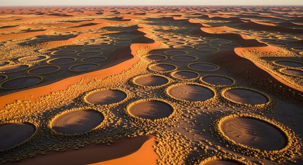 The Namib Desert displays millions of circular areas where grass has created empty circles of earth. Scientists failed to identify their cause for many years. The researchers discovered that “dead zones” form through the combined actions of sand termites and plant competition, which leads to water resource distribution throughout the landscape that creates a giant, eerie honeycomb appearance.