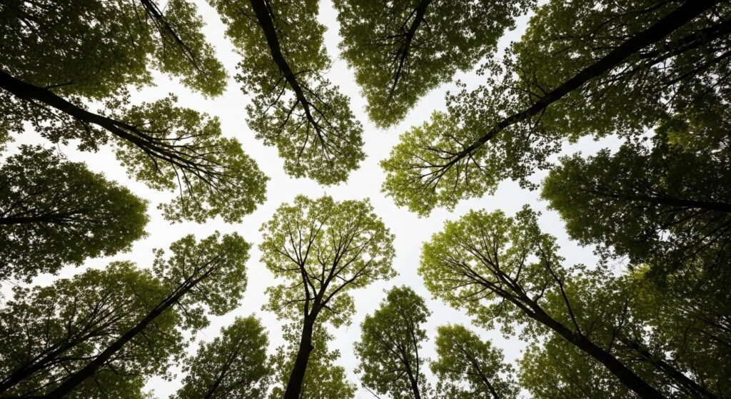 In some forests, mature trees maintain an open space above their crowns, which creates a canopy with channels between the tree tops and trees use this “crown shyness” behavior to prevent leaf-eating larvae and diseases from spreading, which leads to their development of separate “quarantine” areas for each tree to protect its resources from nearby trees.