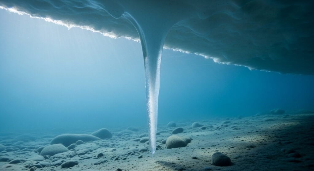The Antarctic ocean produces “fingers of death” which create ice structures that extend into its frozen depths. These tubes contain extremely salty water which sinks to the ocean floor and maintains a temperature that is lower than nearby ocean water and this brinicle creates instant freezing upon contact with the sea floor, which creates ice barriers that trap starfish and urchins within a frozen prison.