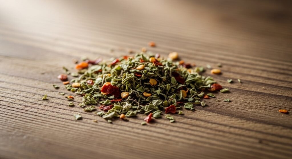 A small amount of dried oregano or red pepper flakes goes a long way and the warm oil allows concentrated flavors to develop into a savory flavor which stops vegetable sweetness.