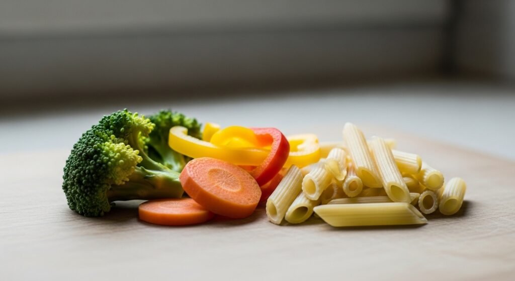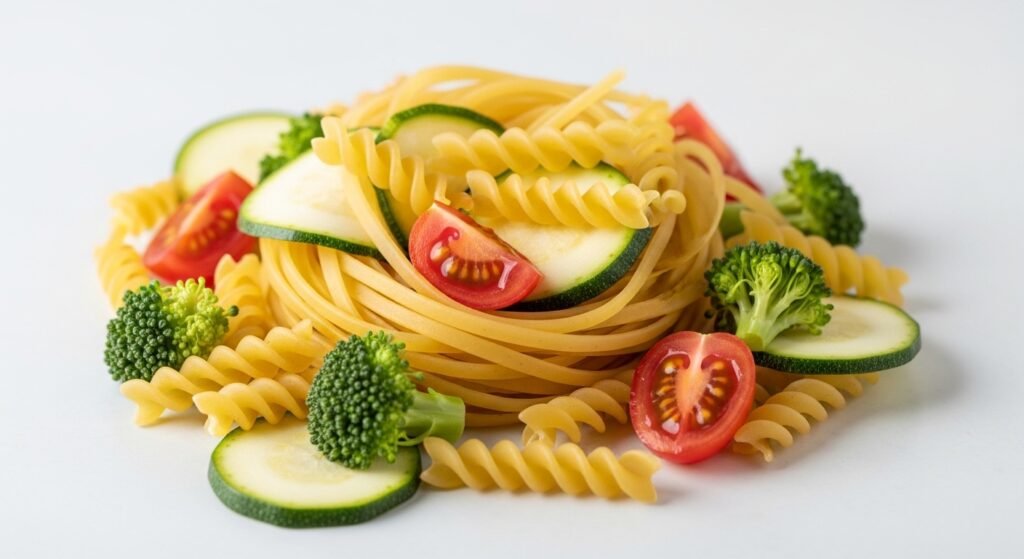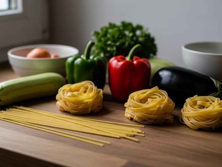 Village cooks use whatever becomes available from their garden. The initial cooking phase needs zucchini and bell peppers and eggplant to be added as tiny cubes which will become soft and form a sauce that will cling to the pasta.