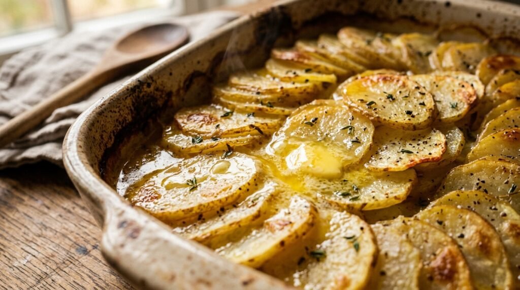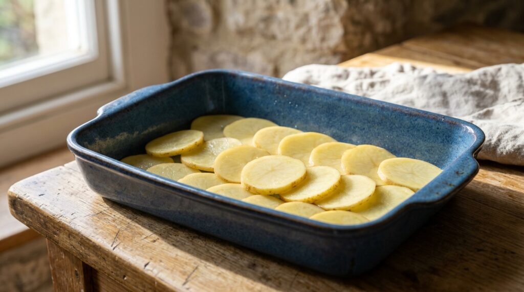 The dish needs to be covered with foil during its first baking stage. The process cooks potatoes with steam until they reach a soft state then you should remove the foil to allow cheese to become a crunchy topping.