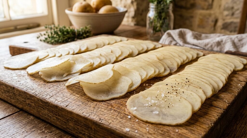 To ensure the pie cooks evenly, slice your potatoes into paper-thin rounds. In Italy, home cooks prefer to use mandoline slicers or extremely sharp knives to create potato layers which become nearly see-through and will cook perfectly with the cabbage.