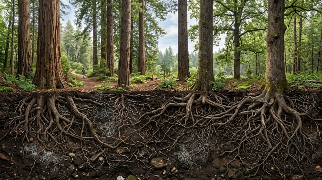 Trees exhibit altered growth patterns beneath the soil. Forests in certain areas experience accelerated growth but decreased tree density which leads to different carbon storage capacities compared to old-growth forests that researchers studied during the previous decade.