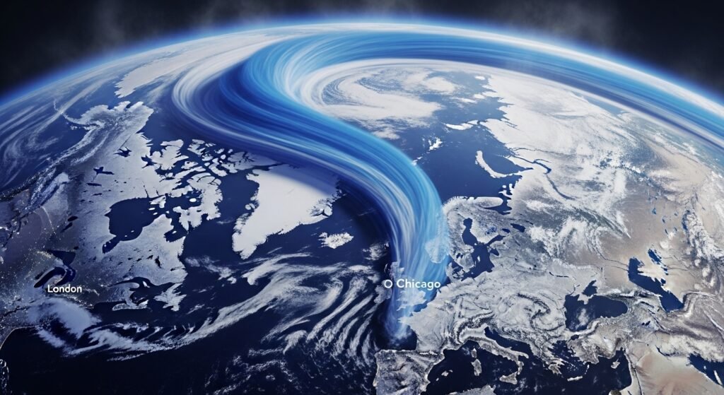 The strong jet stream acts as a rapid wind barrier. The system begins to wander once its speed decreases. A giant “dip” in the wind moved from the Arctic to Chicago and London this morning, which resulted in record-breaking ice.