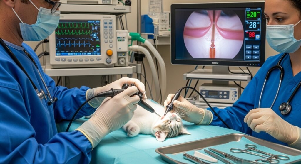 Vets need to complete an operation which will remove the trapped air from a balloon kitten. The procedure typically requires small cuts or a sterile needle to create an air release which produces a hissing sound that mimics tire deflation to deliver instant relief.