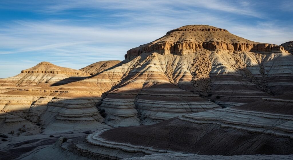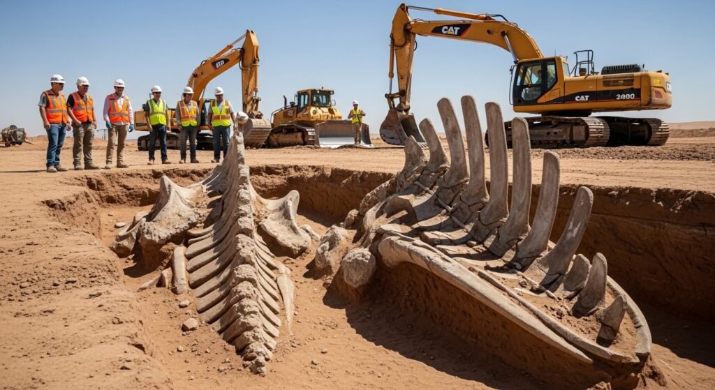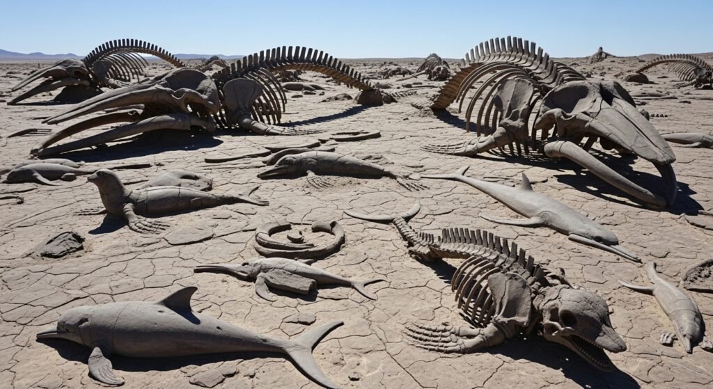 The prehistoric beach where whales died has now transformed into a desert hill location. The ocean floor graveyard transformed into dry land because plate tectonics raised the shoreline over millions of years, after which earth movements pushed the coastal land upwards.