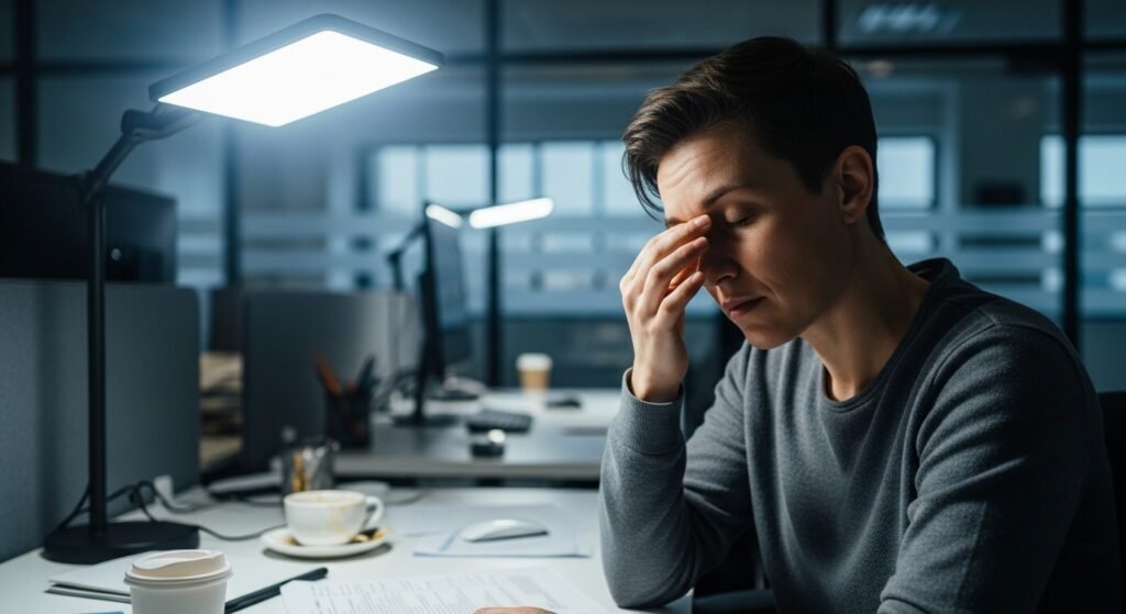 Digital lights which lack quality control operate at high flicker rates which users cannot perceive yet it leads to eye strain and headaches. Users believe they are adjusting to light conditions when their actual problem stems from defective equipment design which natural sunlight does not possess.