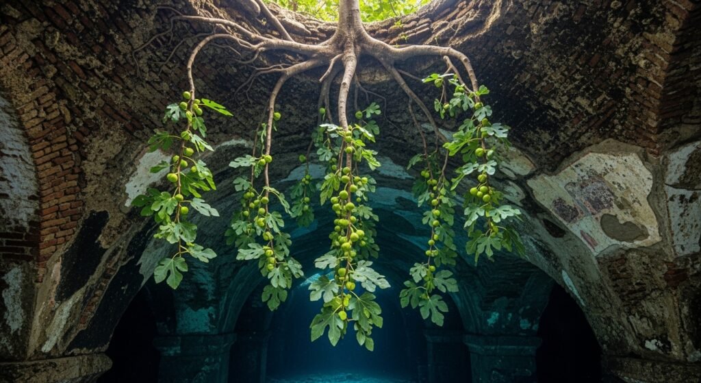 A common fig tree located in Parco Archeologico delle Terme di Baia near Naples grows from the roof of an ancient Roman vault as it completely inverts its natural growth pattern. The tree exists as a living entity which continues to grow toward the floor while remaining healthy.