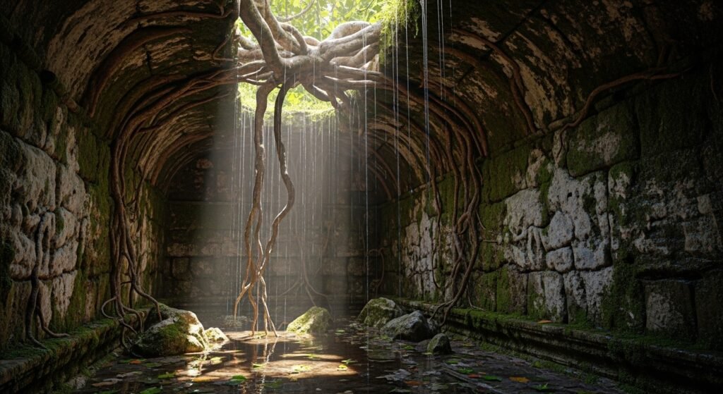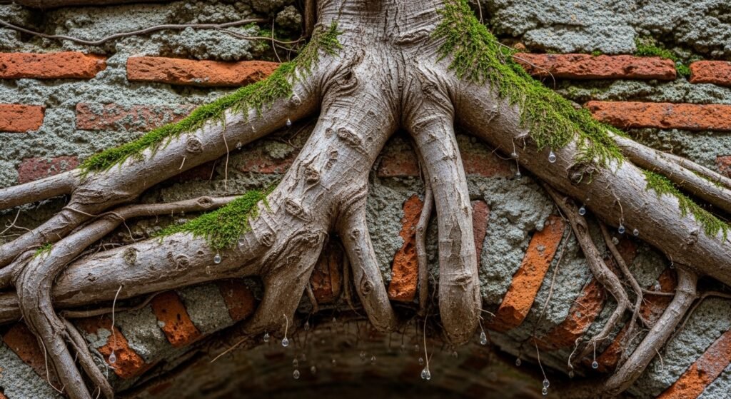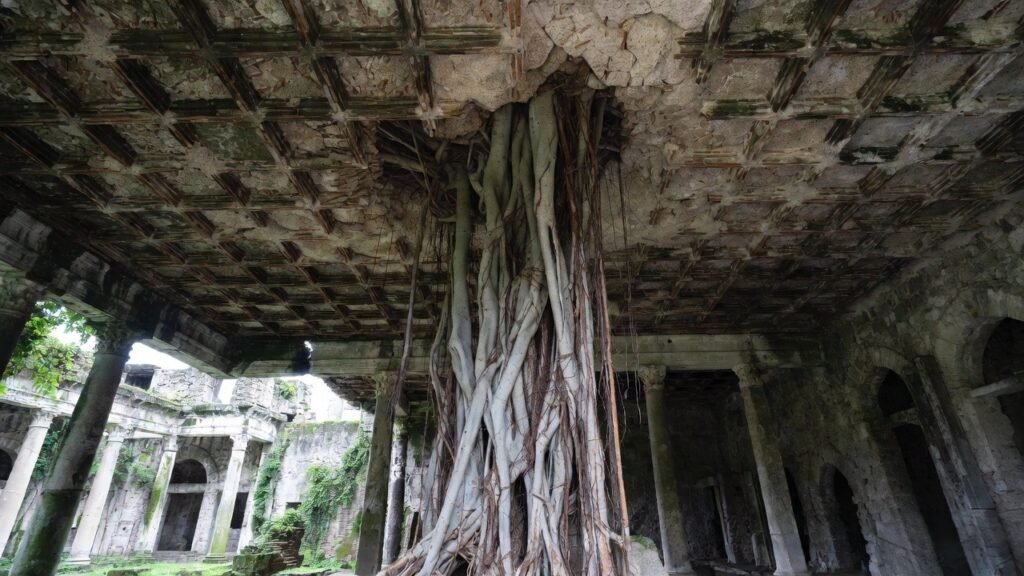 The tree’s weight increases with its growth but the roots maintain their grip on the ancient mortar. The demonstration provides evidence of how fig wood and root systems possess exceptional strength because they can break through solid stone and concrete to create a pathway.