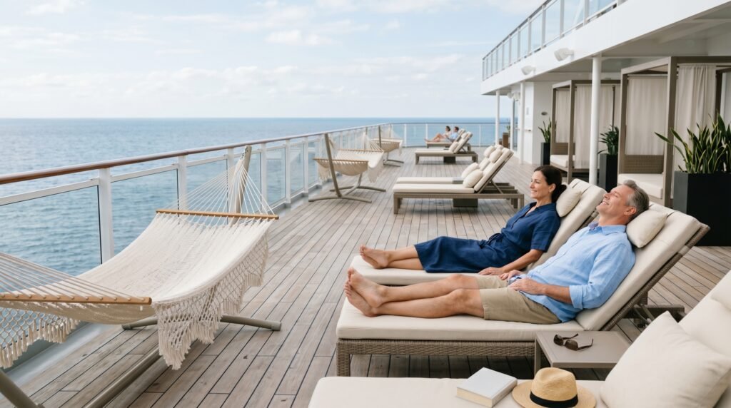 Every ship features the Serenity Adult-Only Retreat, a dedicated deck area for those 21 and older and the area serves as a peaceful space which includes comfortable seating options of loungers and hammocks and a dedicated bar area where guests can read books or take naps without interruptions from nearby swimming activities.