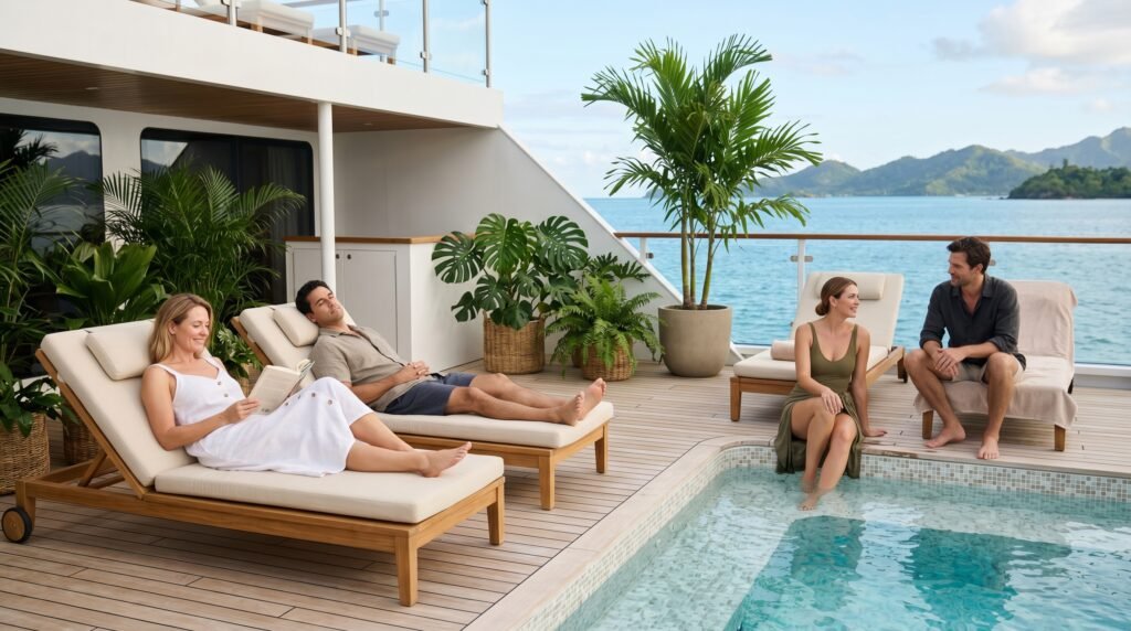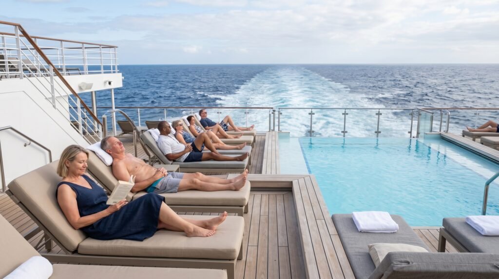 Adults prefer the back pool area which provides a peaceful environment on many ships. The space provides guests with spectacular views of the ship’s wake and a more low-key social atmosphere when compared to the lively primary lido pool.