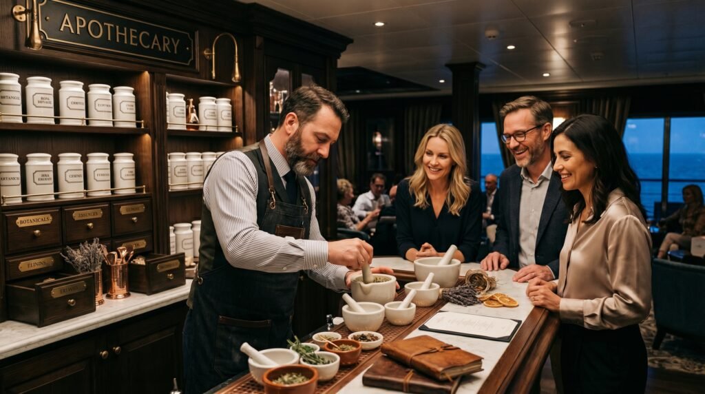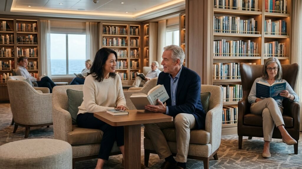 The library bar on some ships provides guests with a peaceful “humanized” area where they can self-serve wine through automated dispensers. The space provides visitors with a refined yet comfortable area where they can engage in quiet discussions or play cards within a living room environment.