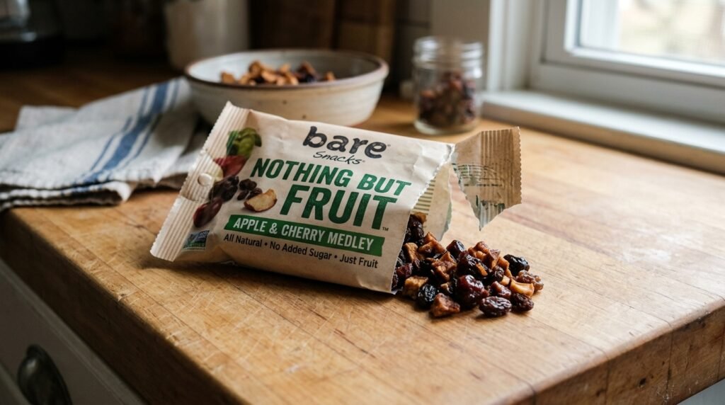 Bare snacks use the slogan ‘nothing but fruit’ to promote their products. The dehydration process removes white sugar from the product but it leads to concentrated fruit sugars which create high glycemic effects when consumers eat one small bag.