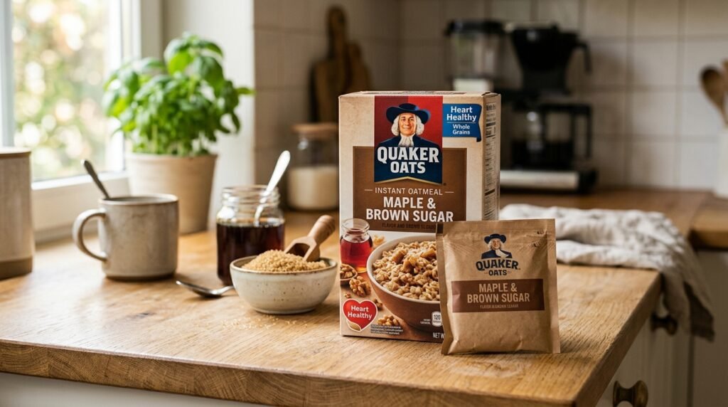 Quaker displays heart health statements on its instant oatmeal packages. Oats provide health benefits yet the flavored ‘Maple and Brown Sugar’ version contains dessert-level sugar content which negates its advantages for certain consumers.