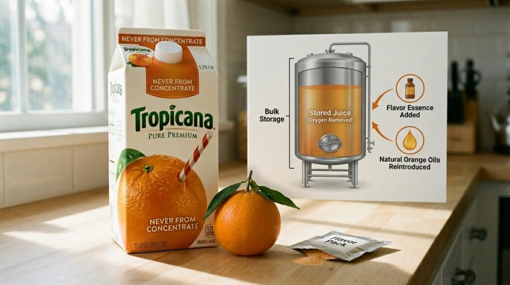 Tropicana states that its orange juice exists as ‘never from concentrate’ product. The juice remains true to its description yet producers store it for extended periods inside massive tanks which lack oxygen for one year. The company adds ‘flavor packets’ to products before bottling to restore orange flavor.