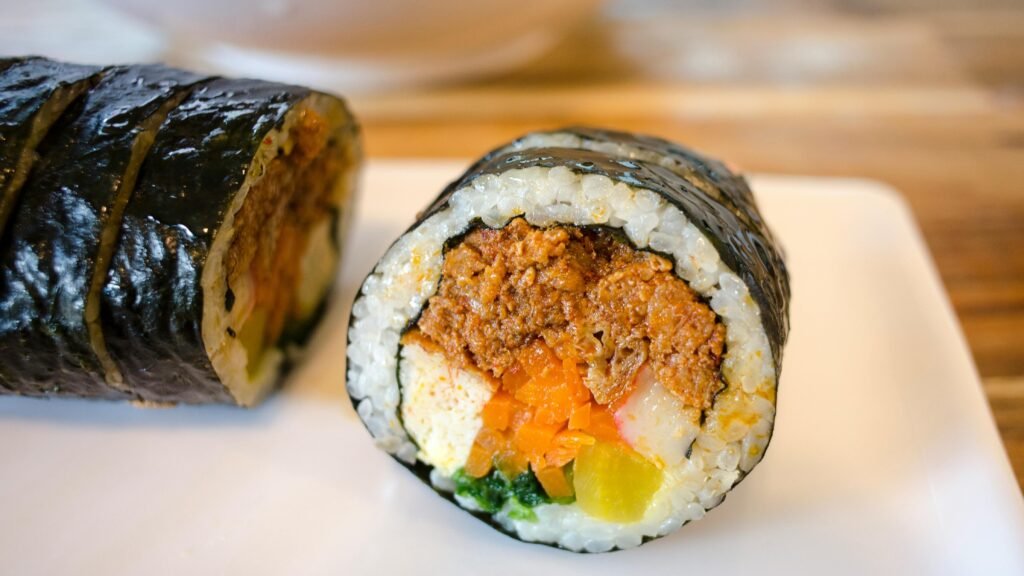 Gimbap (seaweed rice rolls) became popular after “hidden gem” supermarket videos showed this dish. The dish provides both health benefits and visual appeal because its pickled radish and spicy tuna filling options create an attractive portable meal.
