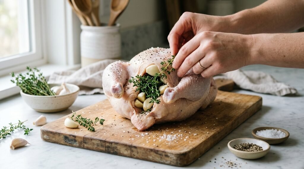 You need to apply salt and black pepper to all skin surfaces and also inside the bird cavity. French chefs use smashed garlic cloves and fresh thyme sprigs which they place inside the bird to achieve a deep aromatic flavor.