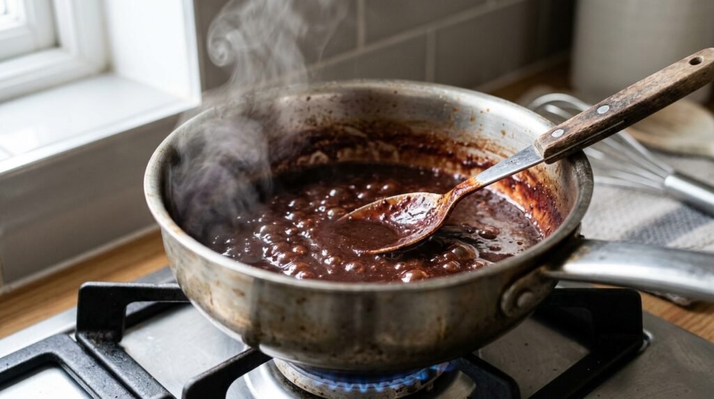 You should pour chicken stock or grape juice into the pot to use as a tool for scraping the browned bits from the bottom. The bits contain concentrated flavor which serves as the key element to create a sauce that tastes like something from a professional kitchen.