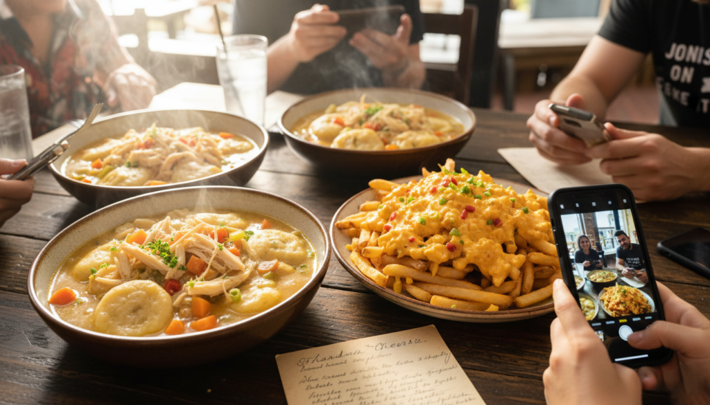 The restaurant’s main cooking element comes from the traditional recipes which Grandma Nellie developed during her time as a textile mill worker who spent her life cooking for her local community. People are coming from all parts of the United States to experience her genuine chicken and dumplings which demonstrate that authentic family culinary traditions produce the best flavor.